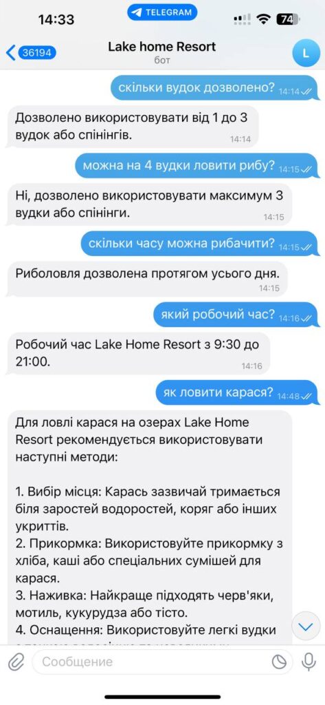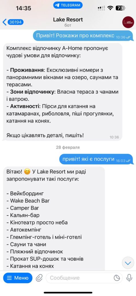 - Надає миттєві відповіді – оперативно відповідає на запити про послуги, умови бронювання та правила комплексу.