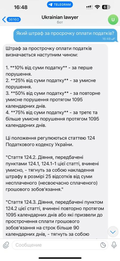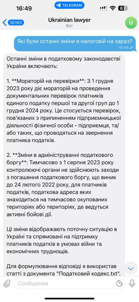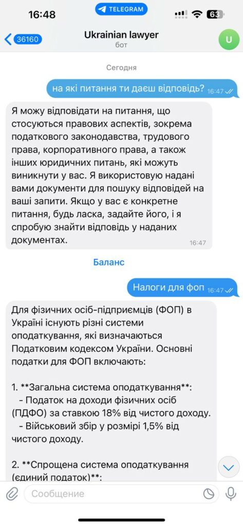 Надає миттєві відповіді на запити користувачів відповідно до актуального законодавства.