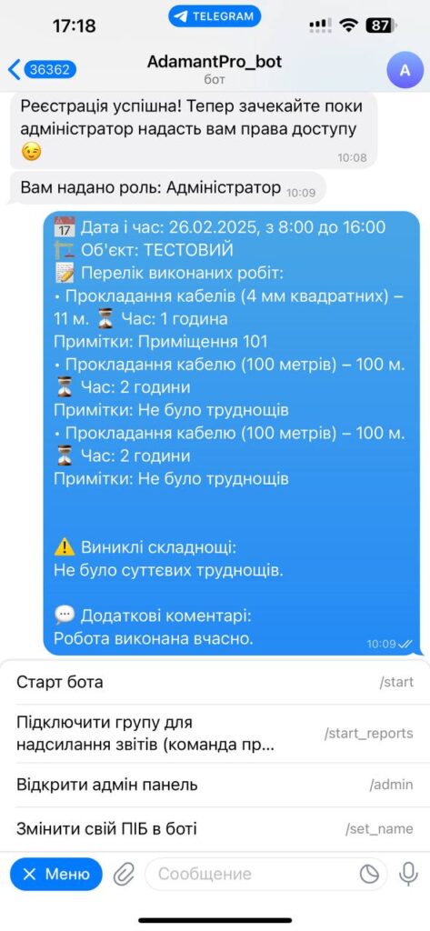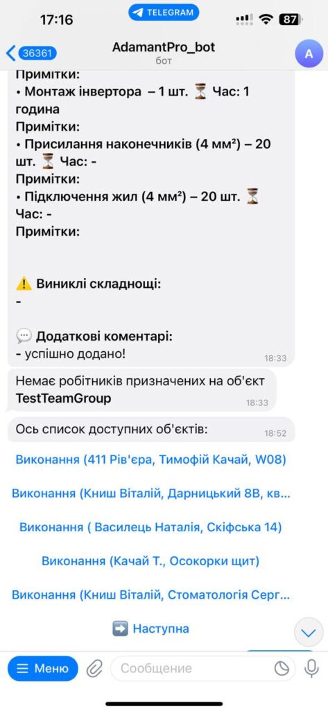 Автоматично визначає об’єкт – бот інтегрується у групу об’єкту, зчитує його назву та додає в систему для зручного вибору під час звітування.